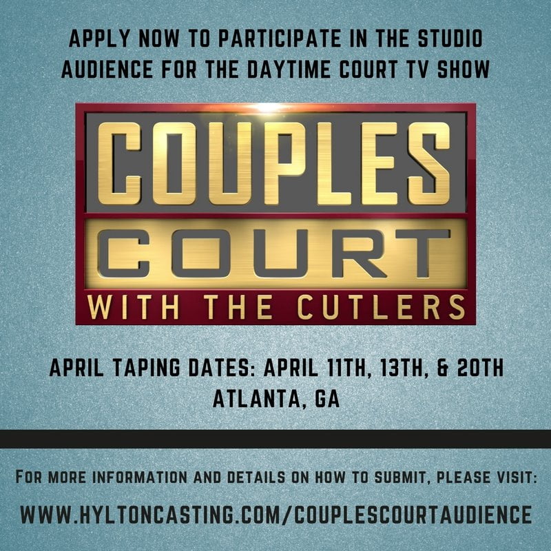APPLY NOW to be a STUDIO AUDIENCE MEMBER on the TV series COUPLES COURT WITH THE CUTLERS SEASON 2 taping in Atlanta, GA March-October, 2018!