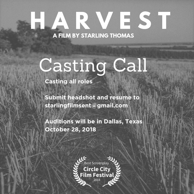 Starling Films in association with Push You Productions are casting for the short film Harvest. Filming will take place in the Dallas/Ft. Worth Area in December. If you are interested in auditioning for this film please submit Headshot and resume to starlingfilmsent@gmail.com
