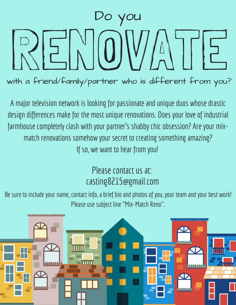 A major television network is looking for passionate and unique duos whose drastic design differences make for the most unique renovations. Does your love of industrial farmhouse completely clash with your partner’s shabby chic obsession? Are your mix-match renovations somehow your secret to creating something amazing?