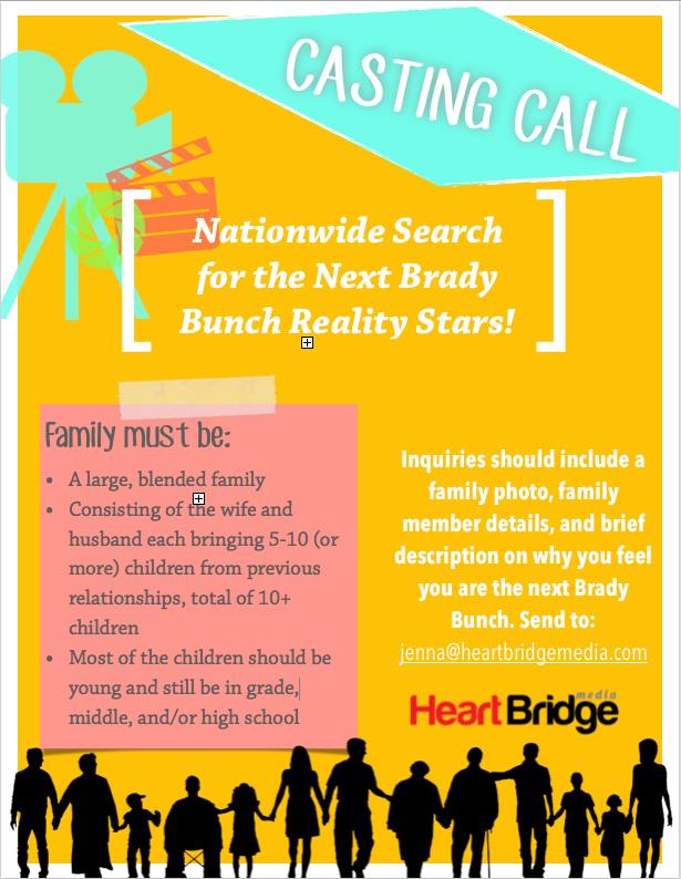 Seeking the next Brady Bunch for a TLC reality tv show. The family must be a blended family with a similar dynamic to that of the Brady Bunch. The wife and husband should each have brought 5+ children of their own into their new blended family, having their own biological children together is a plus.