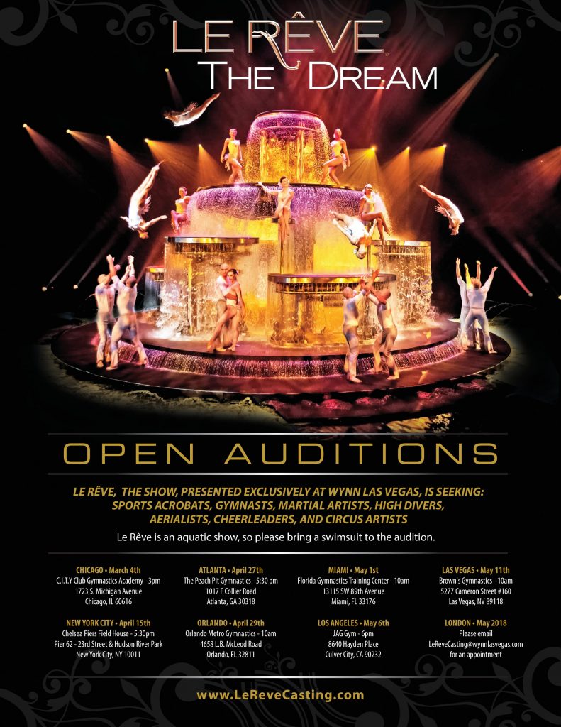 Le Rêve – The Dream, presented exclusively at Wynn Las Vegas, is currently seeking MALE and FEMALE: sports acrobats, gymnasts, martial artists, high divers, aerialists, cheerleaders, and circus artists to join the current cast of performers.