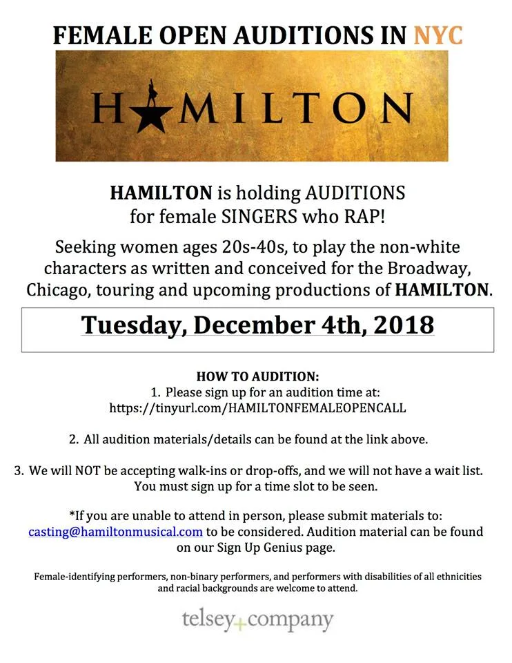 Next week on the 4th, Hamilton will be holding open auditions in NYC for a female character.