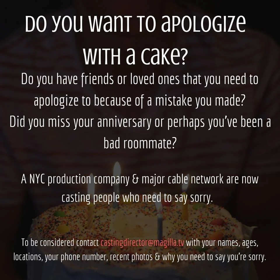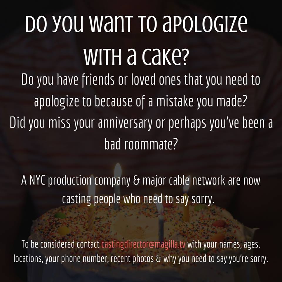 Do you really owe someone an apology? Have you made some mistakes that you would like to express how sorry you are to loved ones, friends, roomies? If so, a reality TV show would love to hear all about it and possibly cast you for a show that will help you make that apology a memorable one.