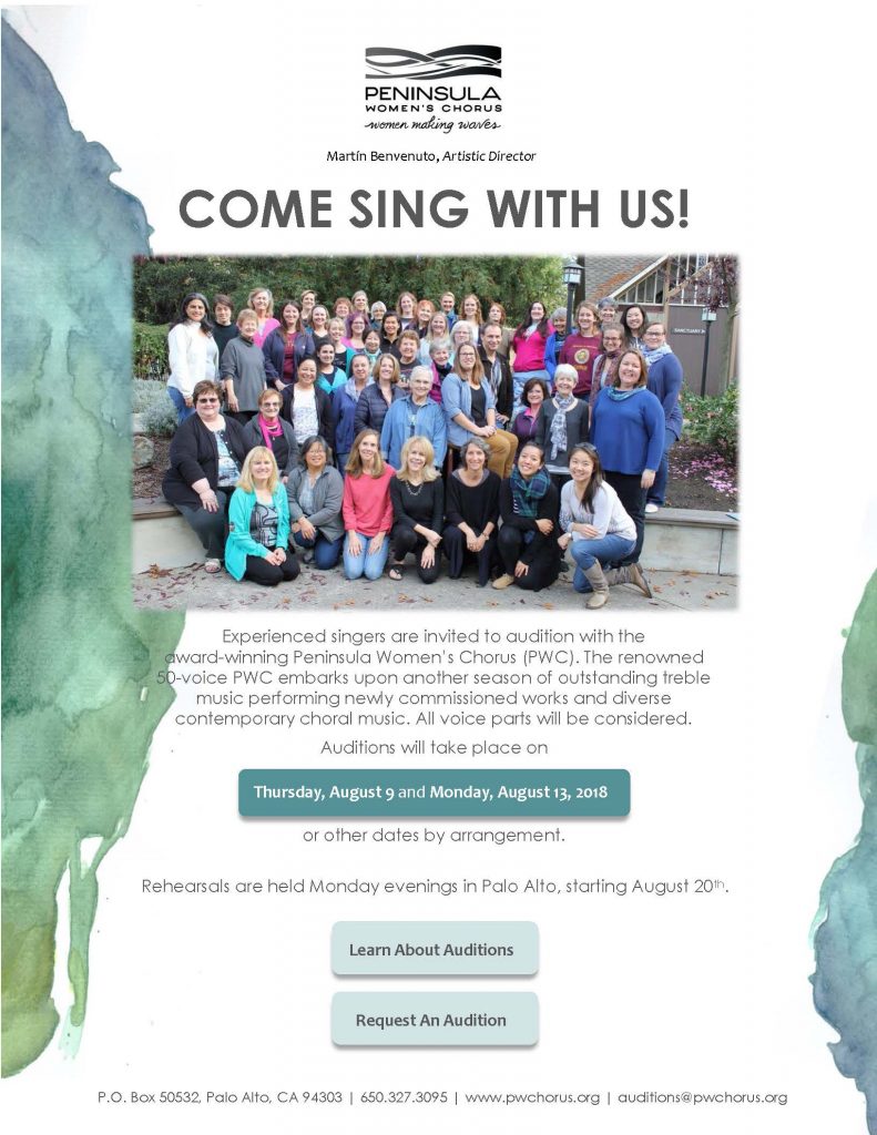 The Peninsula Women’s Chorus (PWC), based in Palo Alto, invites you to join our friendly and talented group of singers, led by Artistic Director Martín Benvenuto. Auditions for all treble voice parts will be held August 9 and August 13 or other dates by appointment. Rehearsals are held Monday evenings in Palo Alto, starting August 20, 2018.