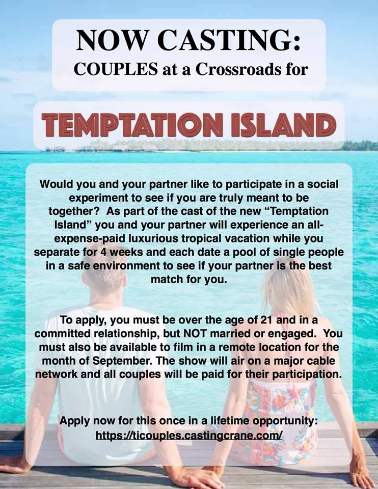 Would you and your partner like to participate in a social experiment to see if you are truly meant to be together? As part of the cast of the new “Temptation Island” you and your partner will experience an all-expense-paid luxurious tropical vacation while you separate for 4 weeks and each date a pool of single people in a safe environment to see if your partner is the best match for you.