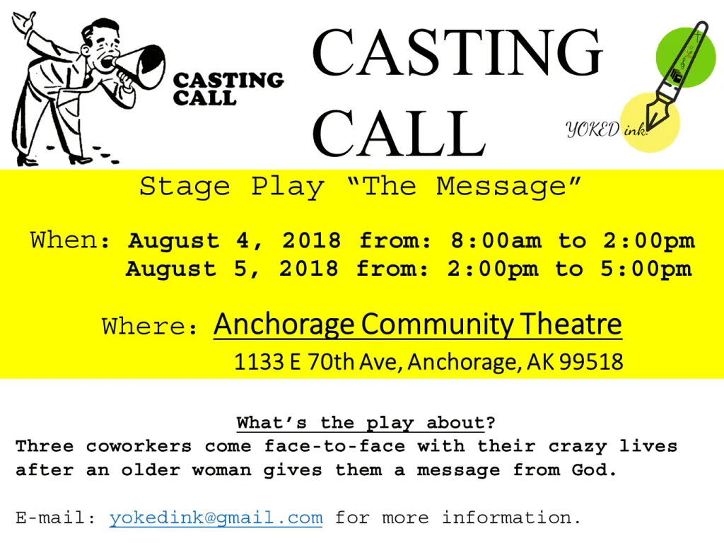 Where: Anchorage Community Theater 1133 E 70th Ave, Anchorage, AK 99518