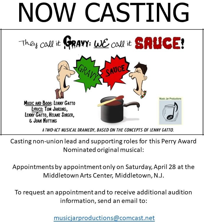Casting lead and supporting roles for the 4th New Jersey run of the Perry Award-nominated original musical, “They Call It Gravy; WE Call It Sauce!”