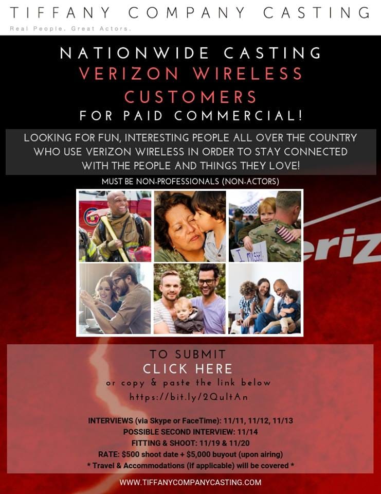 Casting directors are looking for actual Verizon customers and not actors. The Casting team is looking for interesting people all over the US who use Verizon Wireless services in order to connect with those they love.