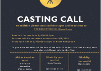Enough Location: Los Angeles Type: Film Roles auditioning for R?C?ARD- AFRICAN AMERICAN MALE 5’10 or taller In shape Age range 20-27 NURSES – GENDER NON SPECIFIC ANY ETHNICITY Age range 21-25 Male / Female DOCTOR AFRICAN AMERICAN/ WHITE AGE RANGE 27-35 EXTRAS FOR HOSPITAL SCENE SEND IN AUDITION TAPES TO TCPRODUCTIONS444@gmail.com Deadline 9/4 3pm Those… Read More »