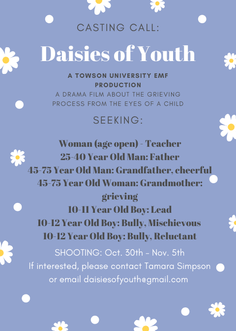 My name is Tamara Simpson and I am the director of Daisies of Youth. It is a student drama short film done in conjunction with the Towson University Electronic Film and Media department.