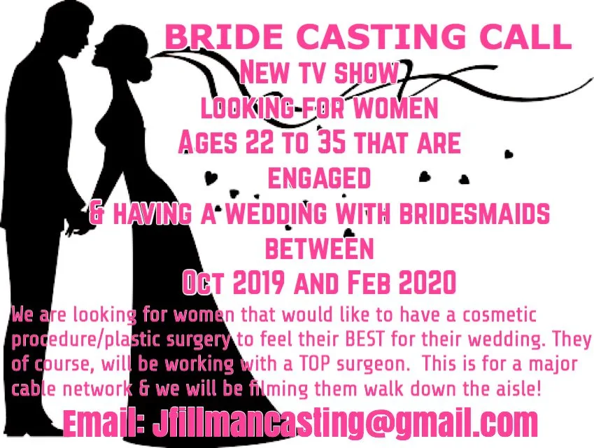TV Casting Engaged Women Ages 22 to 35 that are getting married between Oct 2019 and Feb 2020 and want to get cosmetic surgery before the wedding. Major cable network and you will be filmed walking down the aisle. Must have a huge personality! Email jfillmancasting@gmail.com