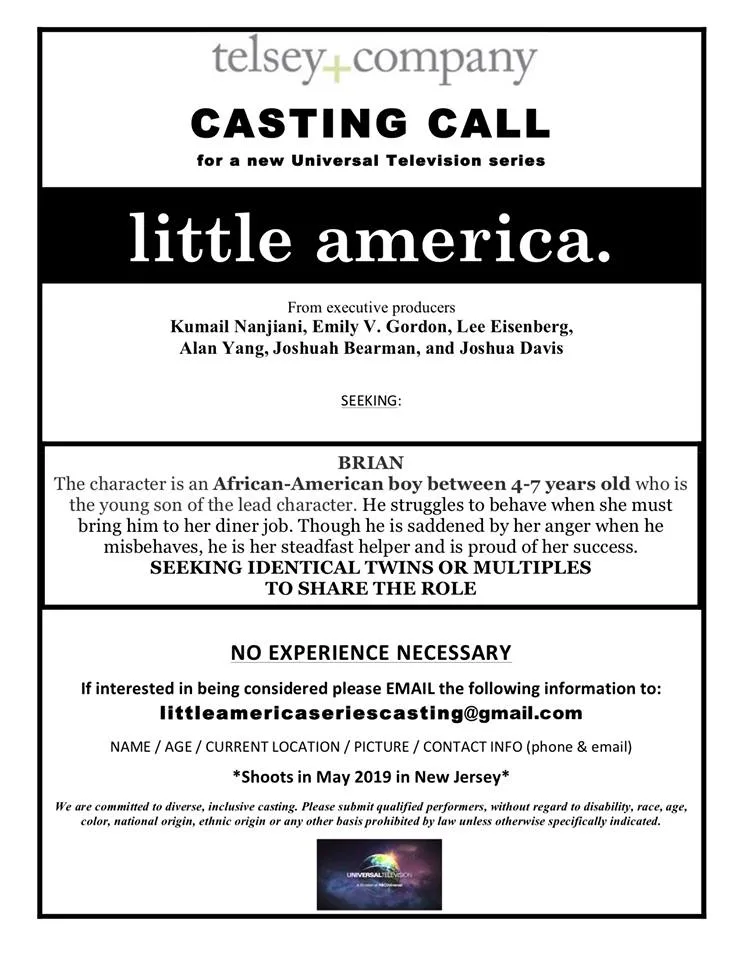 The upcoming Universal television series is holding auditions for the role of Brian, the young son of one of the lead characters. Casting directors for the show are looking to cast African American identical twins to play the role of Brian who will play 4 to 7 years old.