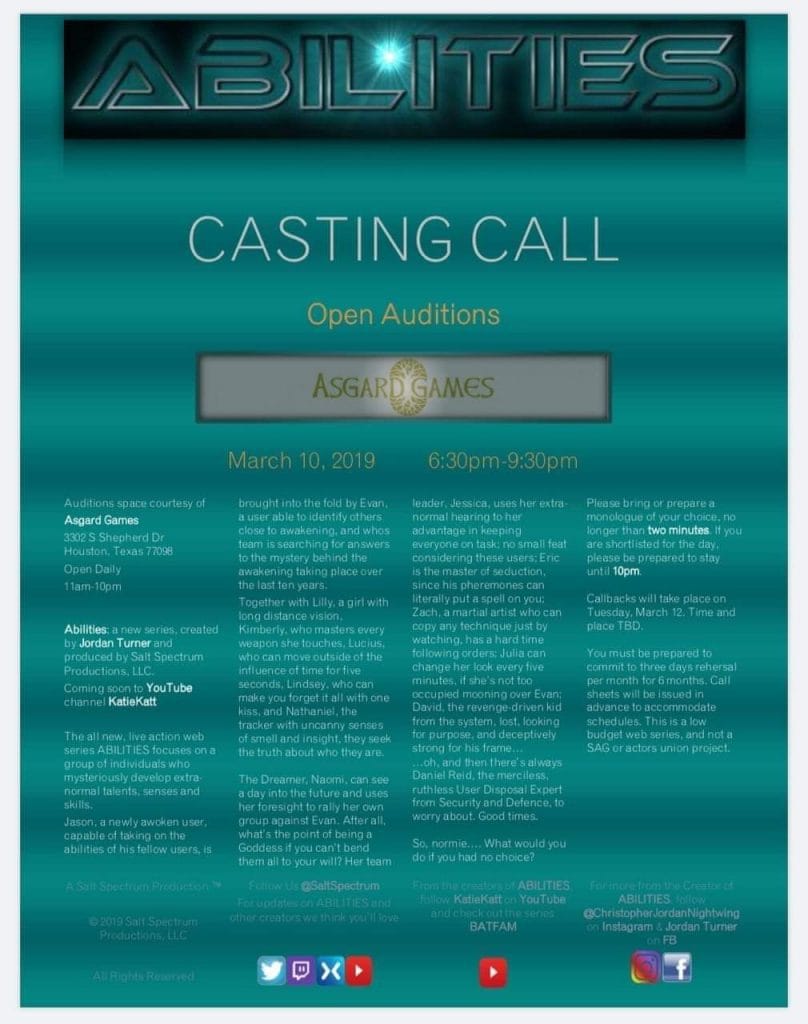 Please bring a monologue under 2 minutes. I know this is last minute, so it doesn’t need to be memorized. Additional info on graphic. So far our audience consists of 4,000 subscribers, but we’re hoping to grow that with this series. The gig will start off no paid, but that is subject to change if we can get the series to take off!