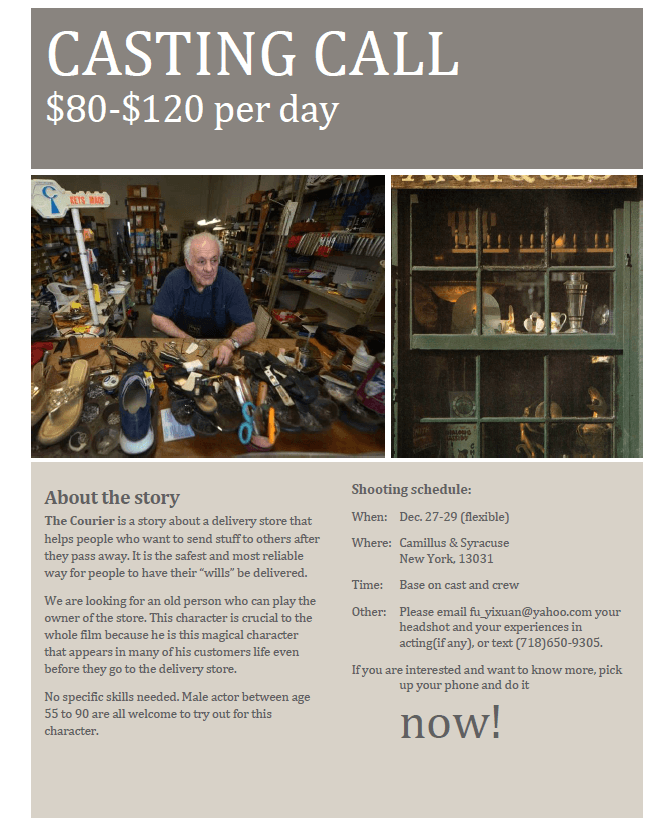 Vlademir: We are looking for a mid-aged guy to play a mafia got in trouble and is running for his life. He can’t see his family because he doesn’t want his family to get involved; he also is afraid to miss out on his little girl’s birthday so he send her birthday gift to a delivery store that hopefully will safely deliver the gift if he can’t make it alive.