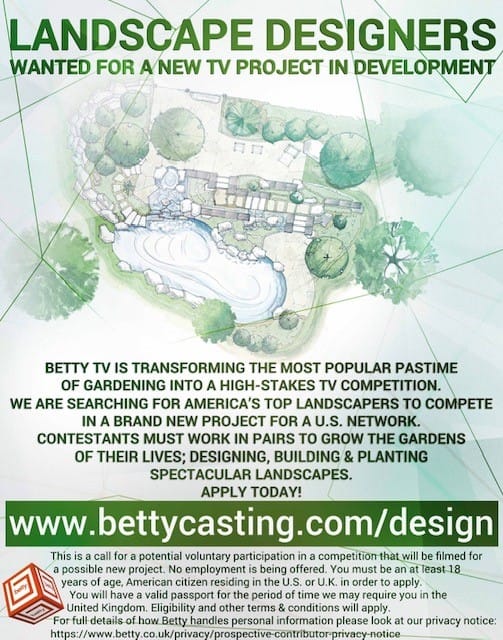 We are searching for America’s top landscapers (American landscape architectures based within the U.S., or U.K.) to compete in a brand-new format for a U.S. network. Contestants will work in pairs to grow the gardens of their lives; designing, building and planting spectacular landscapes.