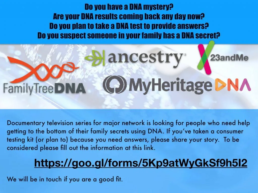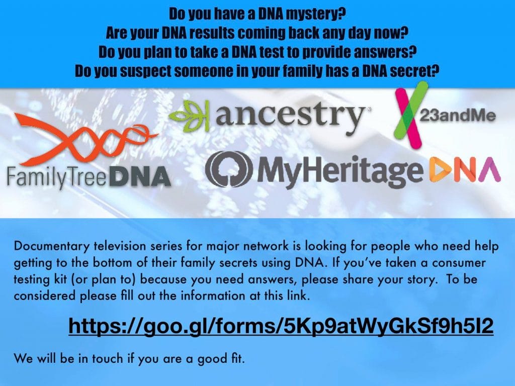 Casting directors for a documentary series are looking for folks that need answers and are hoping that a DNA test can provide those answers or at least get to the bottom of something that their family has been keeping secret.