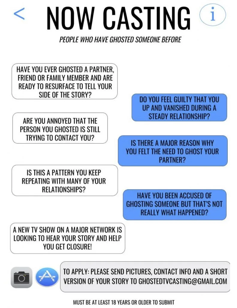 A new reality show on a popular tv network is looking to cast people who have unique and interesting stories of their experience in ghosting someone.