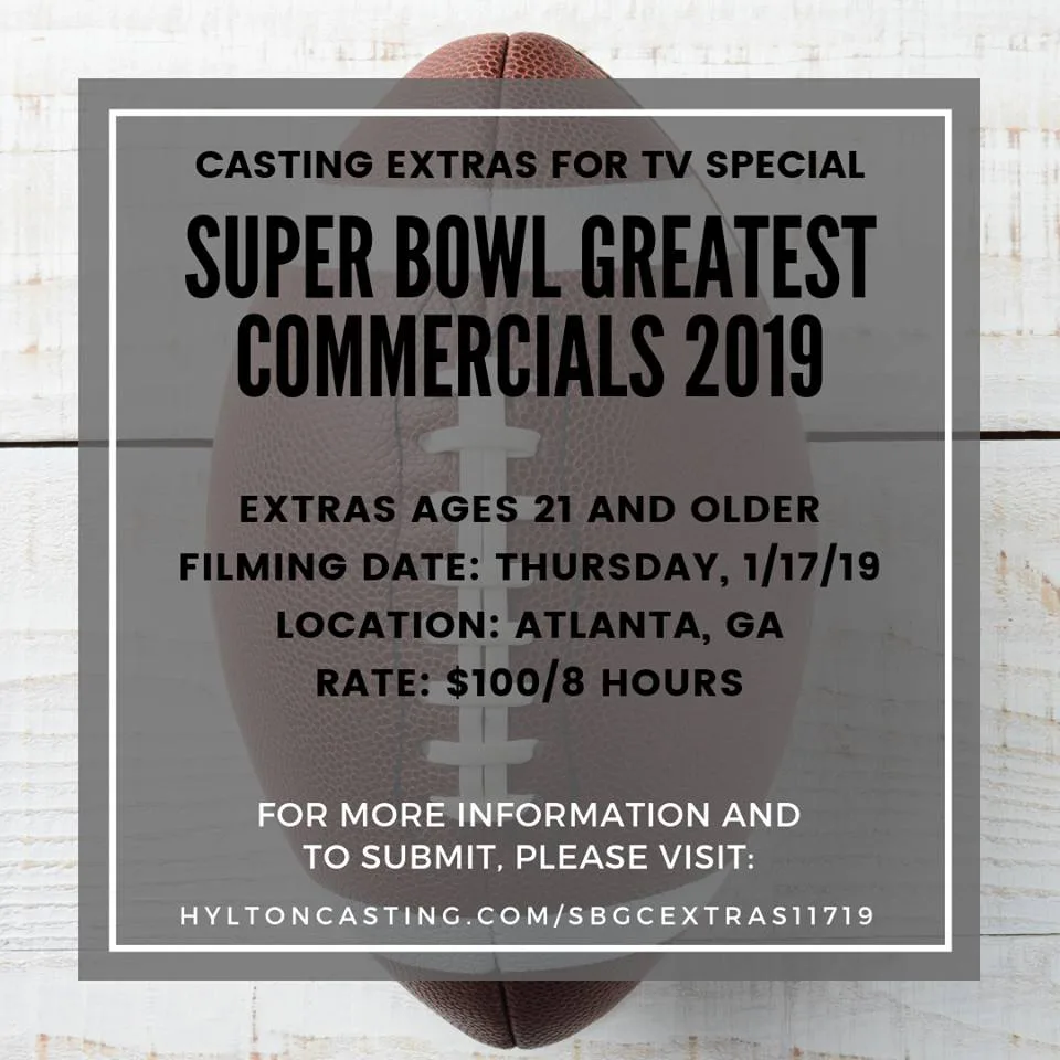 Hylton Casting is casting extras for the taping of the TV special Super Bowl Greatest Commercials 2019 filming in Atlanta, GA on Thursday, 1/17/19. If you are interested in working as an extra, please review the breakdown below and submit your information.