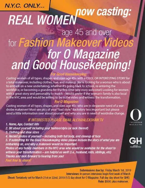 CASTING REAL WOMEN AGE 45+ FOR FASHION MAKEOVER VIDEOS FOR O MAGAZINE & GOOD HOUSEKEEPING!