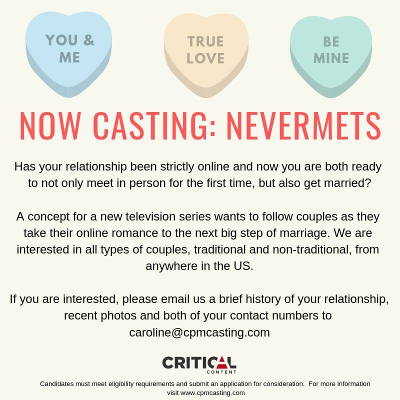 Nevermets We are looking for couples who have been dating online and are planning to marry, but have never met in person. If this is you, we can help make it happen. Please contact caroline@cpmcasting.com or fill out our application here https://cpmcasting.com/2019/01/21/now-casting-nevermets/