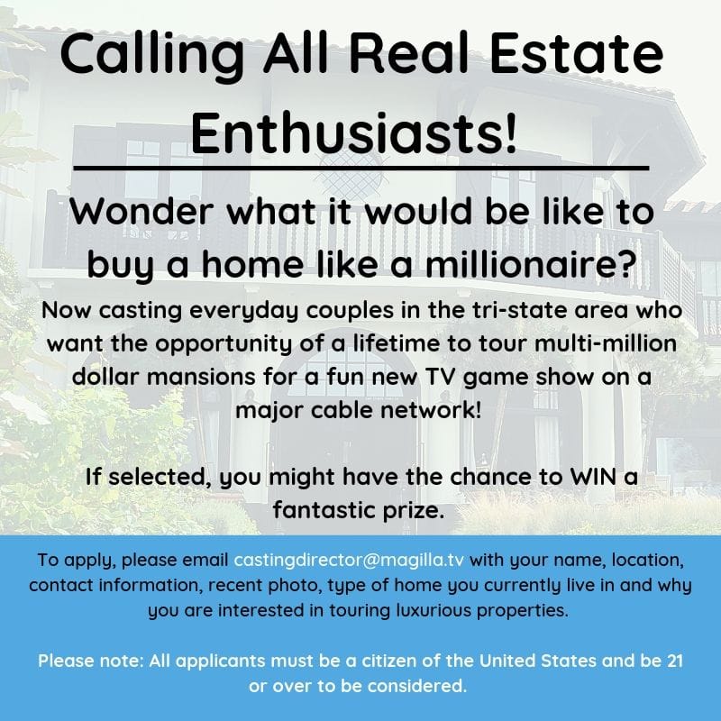 Now Casting everyday couples in the tri-state area who want the opportunity of a lifetime to tour multi-million dollar mansions for a fun new TV game show on a major cable network.