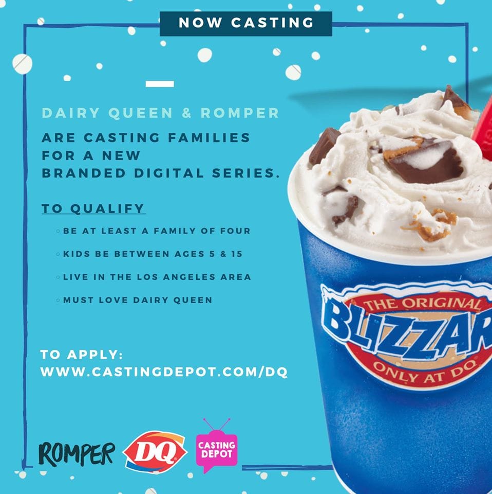 If so, casting directors for a Dairy Queen project are looking for families of at least 4, with kids, in the Los Angeles area to be a part of a new branded digital series.