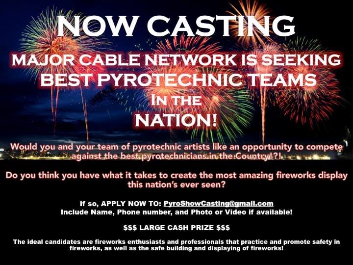 Major Cable Network is Seeking PYROTECHNIC ARTISTS. Currently casting experienced enthusiasts and professional teams for a large new competition series. Winner receives a Large Cash Prize.