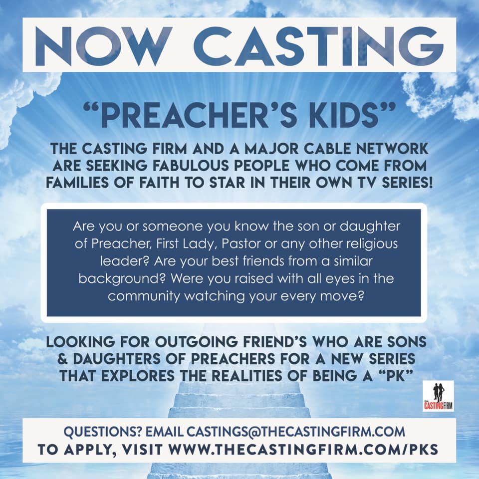 The Casting Firm and a Major Cable Network are seeking fabulous people who come from families of faith to star in their own TV series! If you are in a group of outgoing friends who are sons and daughters of religious leaders, we want to hear from you!