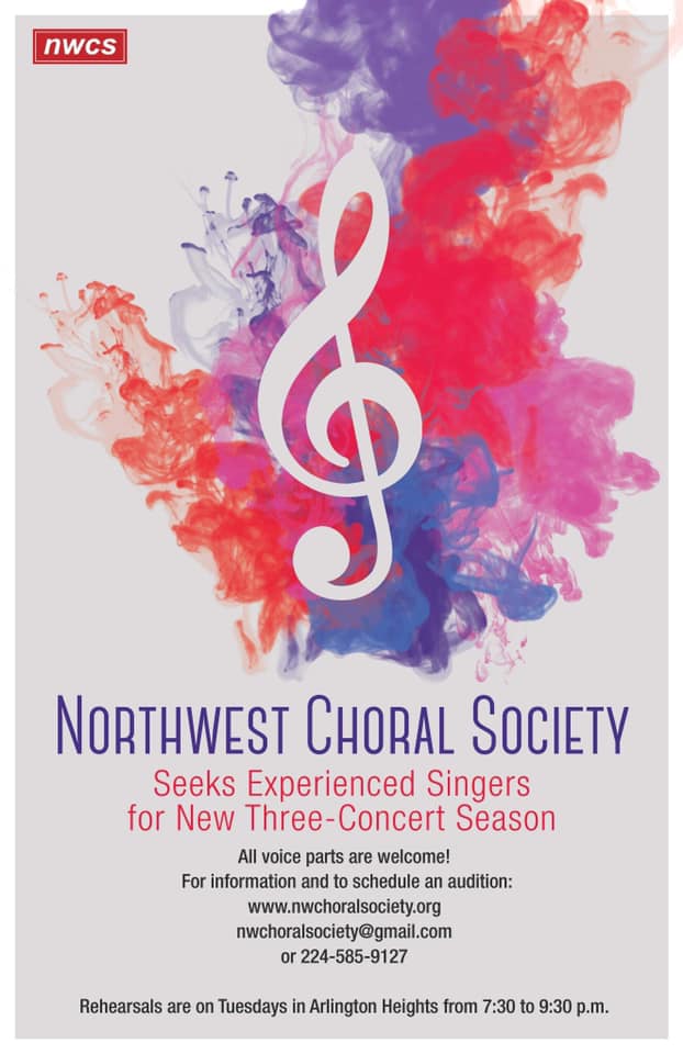 Northwest Choral Society is pleased to announce two events for prospective members prior to the start of its 2019-20 season on September 10. Auditions for new members will be held on Tuesday, August 20 and Wednesday, August 21 beginning each day at 7:30 p.m. at St. Raymond Catholic Church, at the corner of Lincoln Street and Elmhurst Avenue in Mount Prospect.