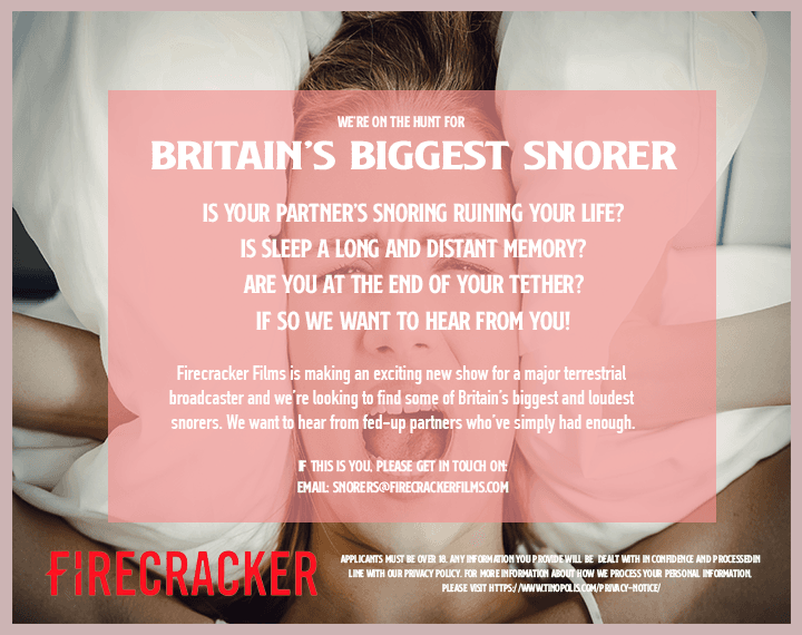 Firecracker Films are looking for #BritainsBiggestSnorer! If you think you can take the crown, or nominate a partner who could, we want to hear from you!