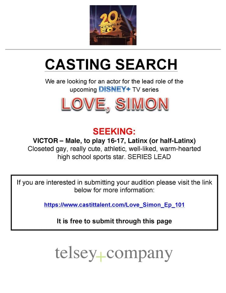 The Disney TV / 20th Century FOX production is looking to cast the lead role of Victor. Casting directors at Telsey are looking for a male actor of Latin heritage to play the role of the 16 to 17 year old, gay character. The actor will be the series lead and is described as a gay teen that is still in the closet. He is cute, athletic, well liked and a warm-hearted high school sports star.