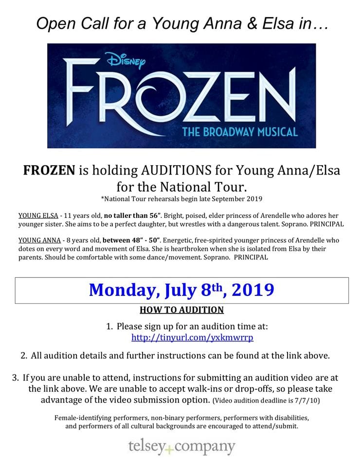 Open auditions for Disney show are being held in NYC for 2 girls to play a young Elsa and Anna in the national touring production of Disney’s Frozen.