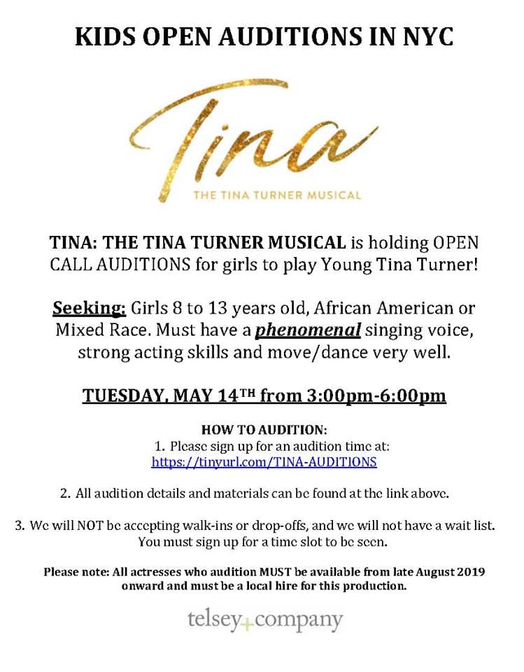 The musical seems to be opening on Broadway this year and casting directors with NYC’s Telsey & Co. are holding open auditions for the role of a young Tina Turner. This is a musical and girls applying should have an amazing singing voice and also be able to dance.