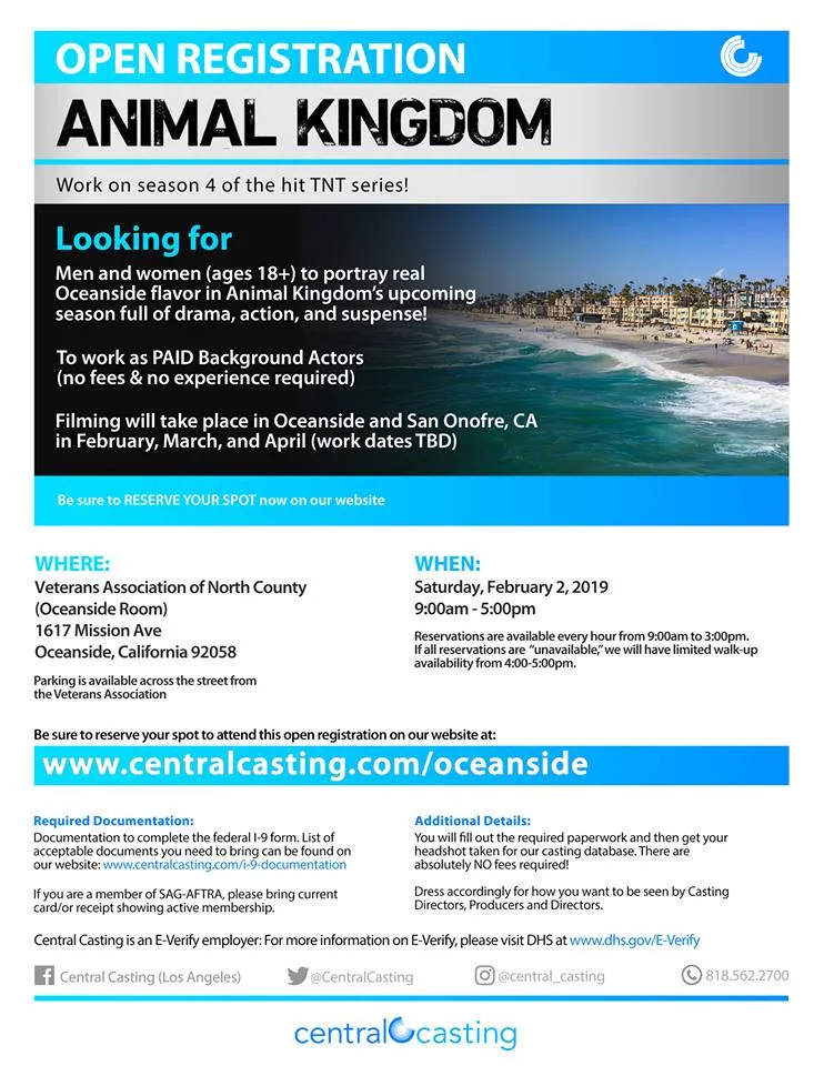 Season 4 of Animal Kingdom is going into production and an open call is being held in Oceanside, CA, where the TV series films. Central casting will be holding open registrations for folks that live in the San Diego / Oceanside area that would like to find some work as paid background actors.