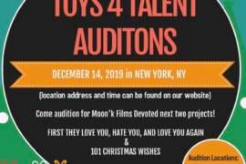 Toys 4 Talent Auditions Location: New York, NY Type: Film Moon’k Films Devoted will be having open call auditions/toy drive… Read More »Auditions in NYC for Several Indie Film Roles