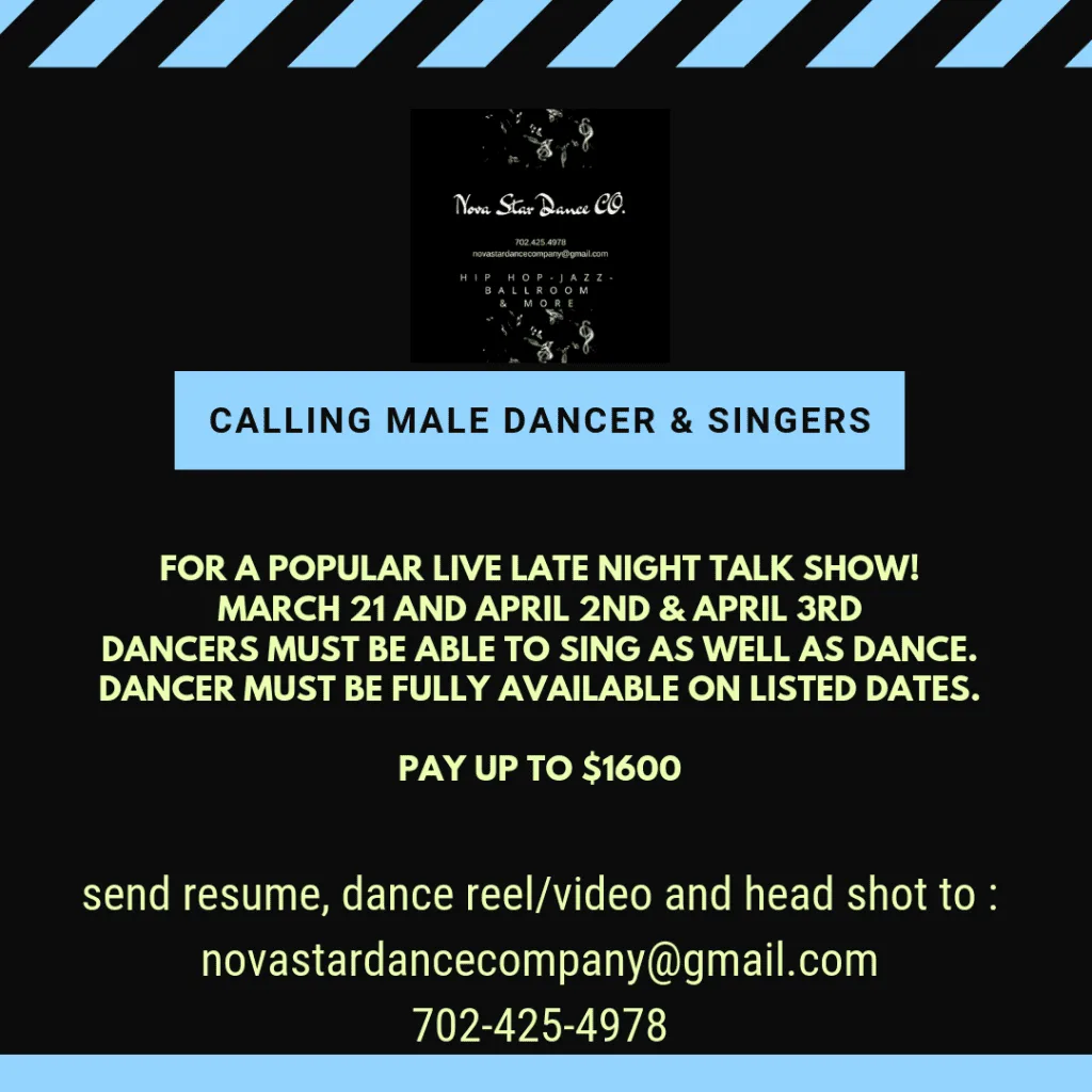 Now casting Male Dancers and Singers ages 18-30 for live Talk Show taping in Las Vegas.