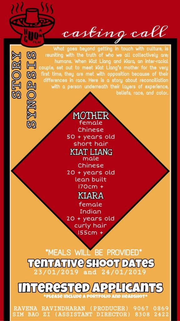 Please contact Bao Zi at baozisim@gmail.com and state your choice of role by 14 Jan 2019. Do send in your headshot or acting showreel should you have one if you are interested! Thank you!