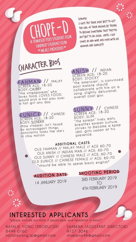 Hi we are students from Temasek Polytechnic looking for actors with the following description: