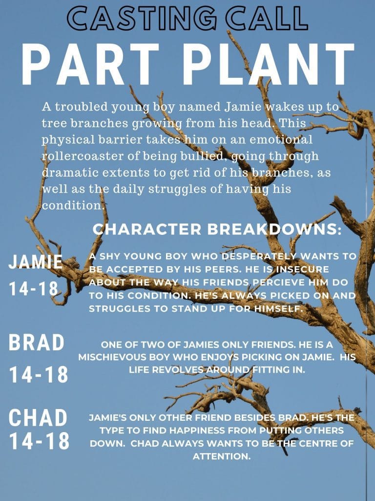 Part Plant is the tale of a troubled boy named Jamie who deals with bodily changes while entering his teenage years. Although these aren’t any ordinary changes. He wakes up one morning with the abnormal condition of branches growing out of his head. This physical barrier takes him on an emotional rollercoaster of being bullied by his friends, going through dramatic extents of trying to get rid of his branches, as well as the daily struggles of having this condition.