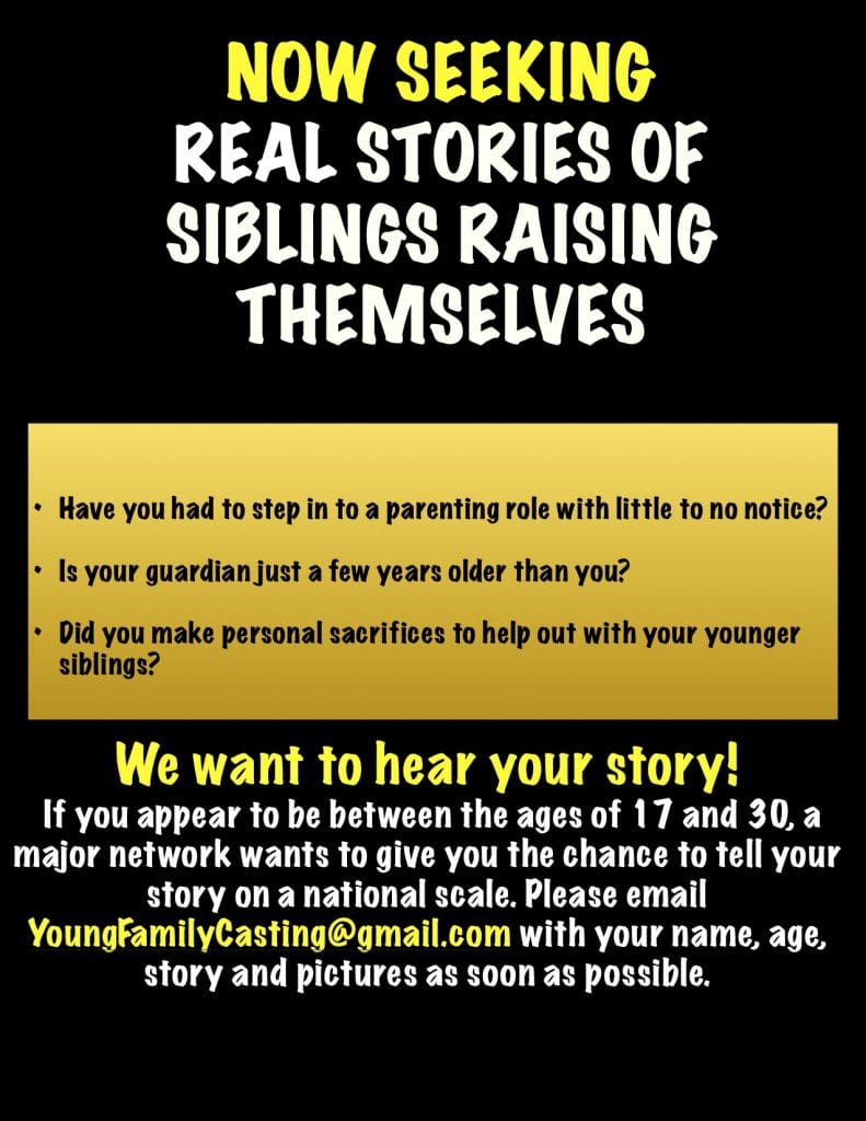 A new docu-series from a major network is casting for stories where siblings are raising each other with out any parents in the picture.