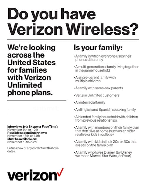This casting notice was posted by: V E R I Z O N SEARCHING ACROSS USA FOR BILINGUAL FAMILIES WITH VERIZON PHONE PLAN