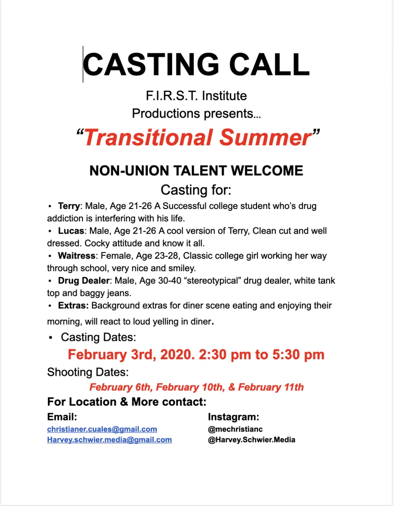 • Extras: Background extras for diner scene eating and enjoying their morning, will react to loud yelling in diner.