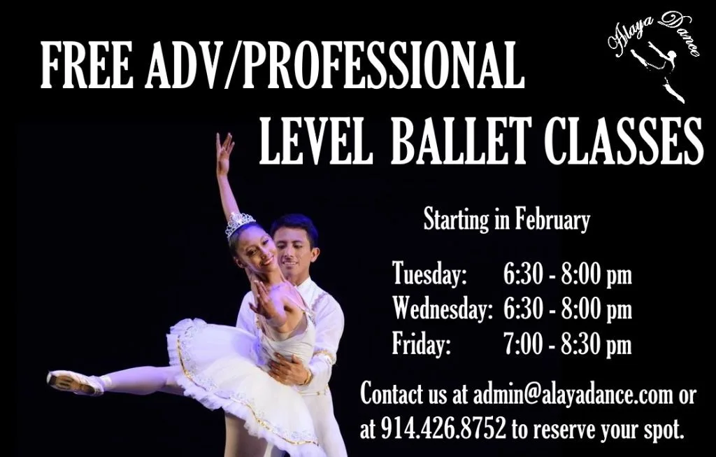 Alaya Dance is offering free adv/pro ballet classes starting in February. Classes will take place at our studio located at 692 Saw Mill River Road in Ardsley NY. Please send an email at admin@alayadance.com to reserve your spot or if you have any questions.