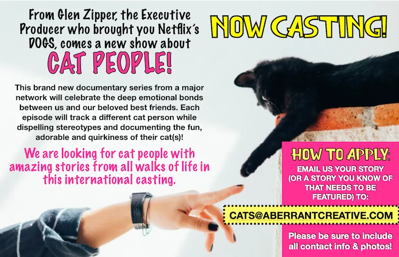 WORLDWIDE CASTING! From Glen Zipper, the Executive Producer who brought you Neflix’s DOGS, comes a new show about CAT PEOPLE! We are looking for cat people with amazing stories, from all walks of life.