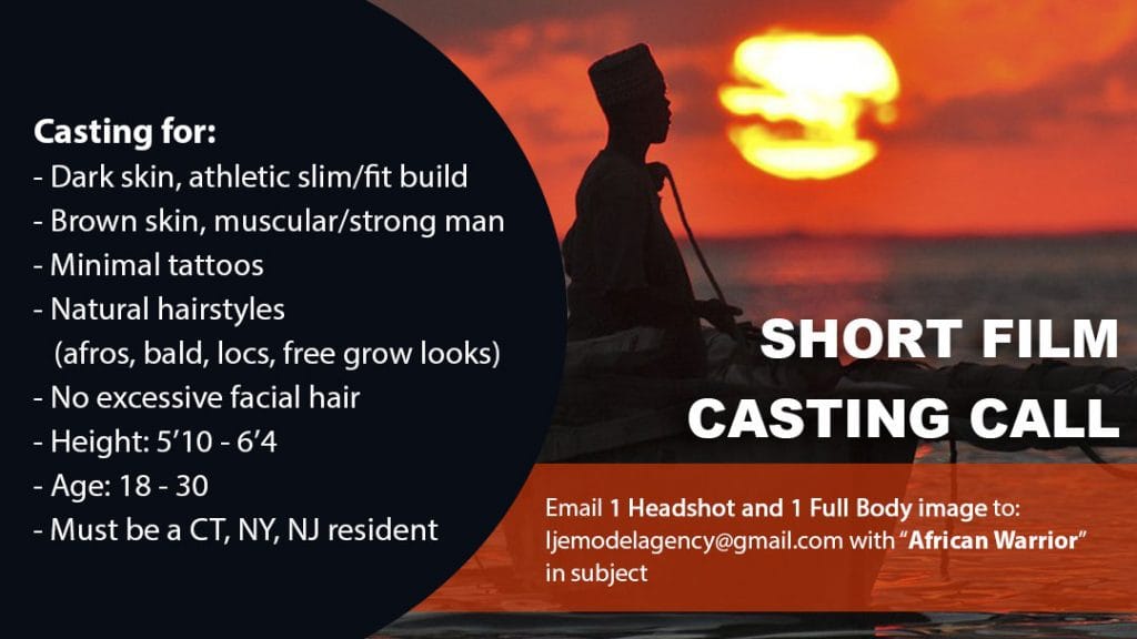 Please submit 2 current unedited headshots and 1 full body shot, location and contact information to LJEModelAgency@gmail.com. In subject “African Warrior”
