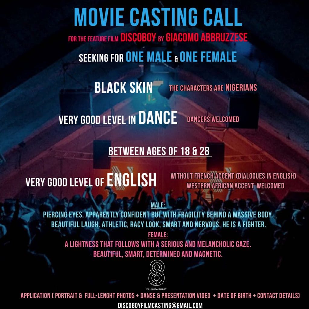 For the feature film DISCOBOY by Giacomo Abbruzzese, we are seeking for one male and one female.