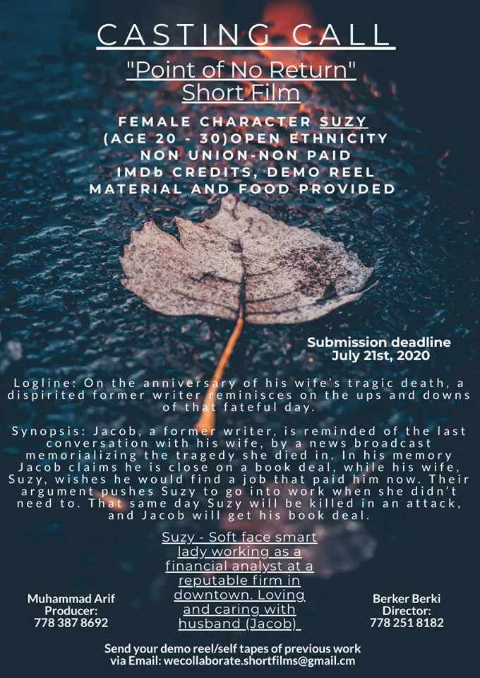 Compensation: You will be given an IMDB Credit and Lunch provided on Set. Please list any allergies to the team.
