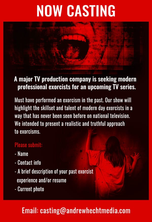 A major TV production company is seeking modern professional exorcists for an upcoming TV series.
