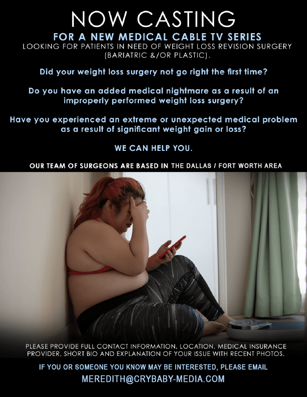 In conjunction with a major cable TV network, we are currently casting for people who are in need of weight loss revision surgery (bariatric and/or plastic). Did your weight loss surgery not go right the first time? If so, we can help. We are working with an elite team of bariatric and plastic surgeons based in the Dallas / Fort Worth area.