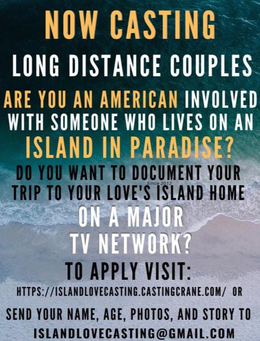 If this sounds like you (or anyone you know), please apply here: https://islandlovecasting.castingcrane.com/ or send your Name, Age, Photos, and your Love Story to lslandLoveCasting@gmail.com.